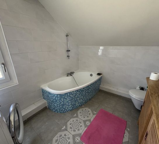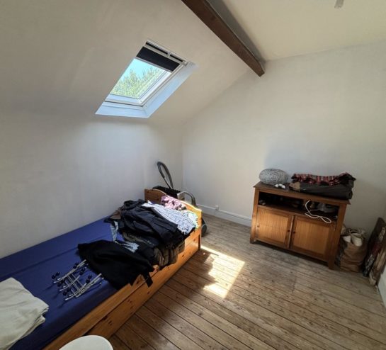 À l’étage, vous trouverez deux grandes chambres, une chambre d’enfant ou bureau, ainsi qu’une salle de bain fonctionnelle avec double WC également. Un grenier vient compléter l’espace de rangement.