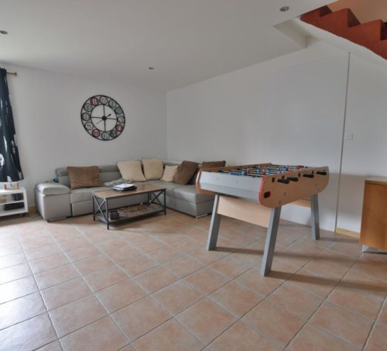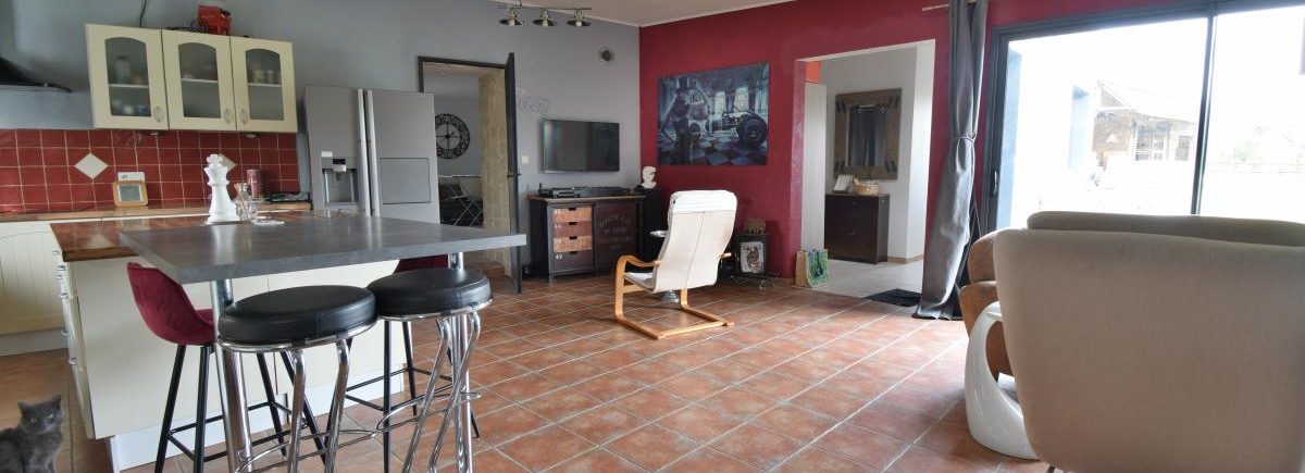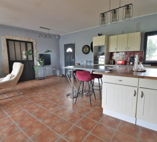 Une pièce de vie spacieuse et lumineuse, avec séjour et cuisine ouverte aménagée et équipée, bénéficiant de grandes baies vitrées,