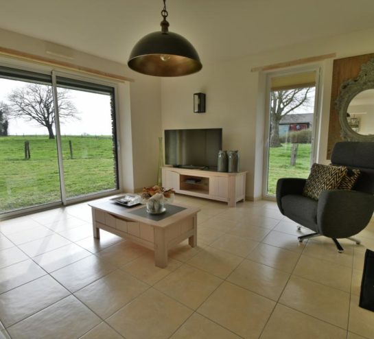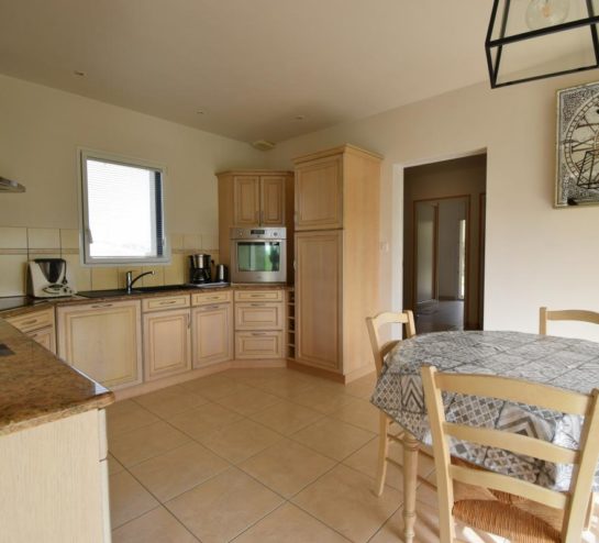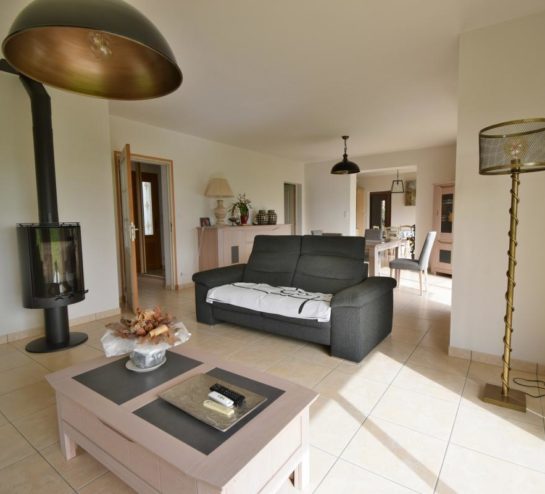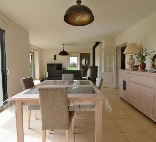 Dès l’entrée, la maison dévoile une vaste pièce de vie lumineuse grâce à ses grandes baies vitrées ouvrant largement sur le jardin. Cet espace convivial accueille un salon séjour chaleureux agrémenté d’un poêle à bois, ainsi qu’un espace salle à manger permettant de profiter pleinement de la vue sur l’extérieur. Dans le prolongement, la cuisine aménagée et équipée dispose également d’un coin repas fonctionnel, idéal pour la vie quotidienne.