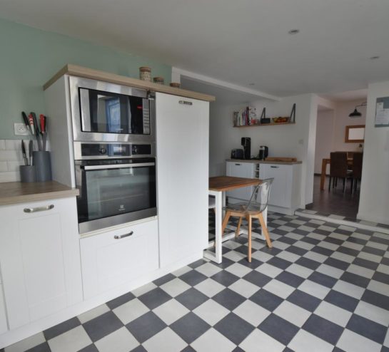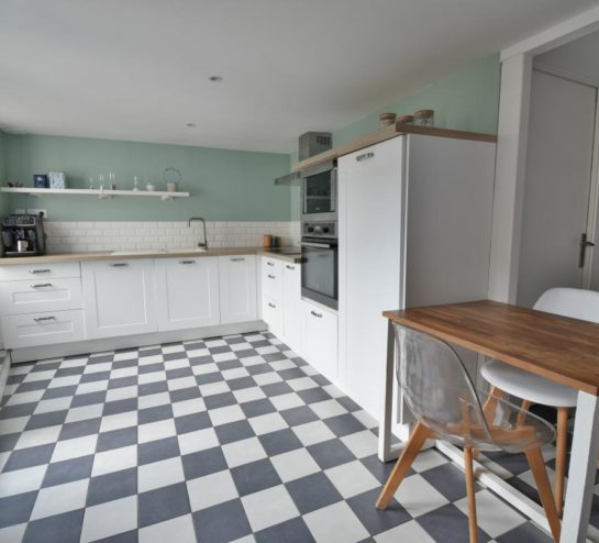 La cuisine aménagée et équipée est indépendante, tout en restant très accessible depuis la pièce de vie, offrant un vrai confort d’usage au quotidien.