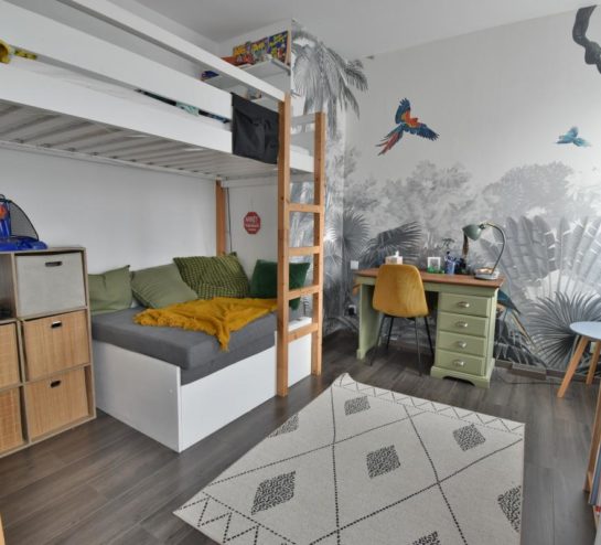 Le deuxième étage accueille une grande mezzanine, idéale en bureau, salle de jeux ou espace détente, ainsi qu’une quatrième chambre.