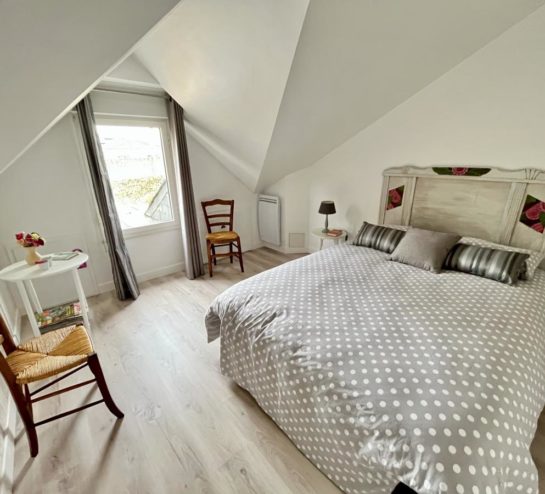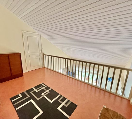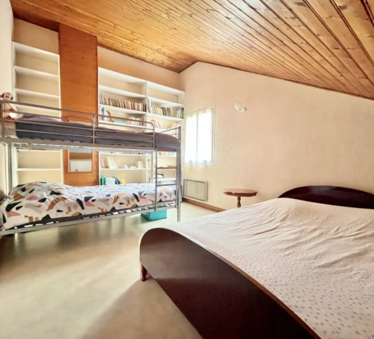 À l’étage, un palier dessert une première chambre, un grenier, une mezzanine ouverte sur le séjour et une autre chambre disposant de son lit mezzanine.