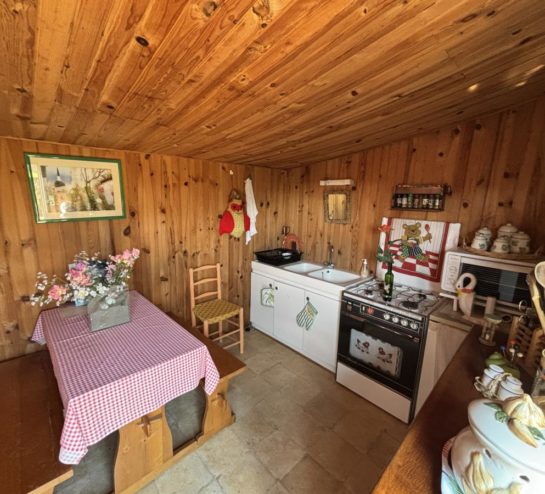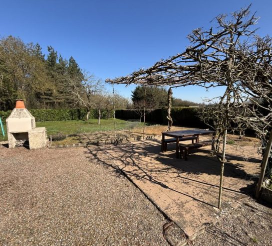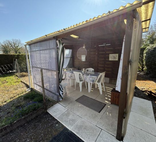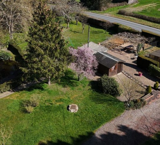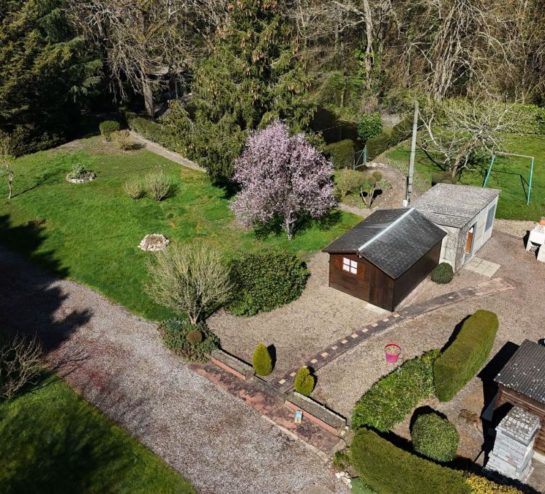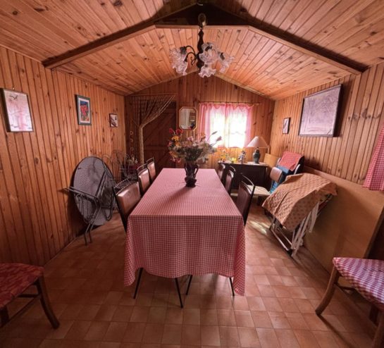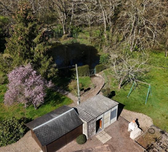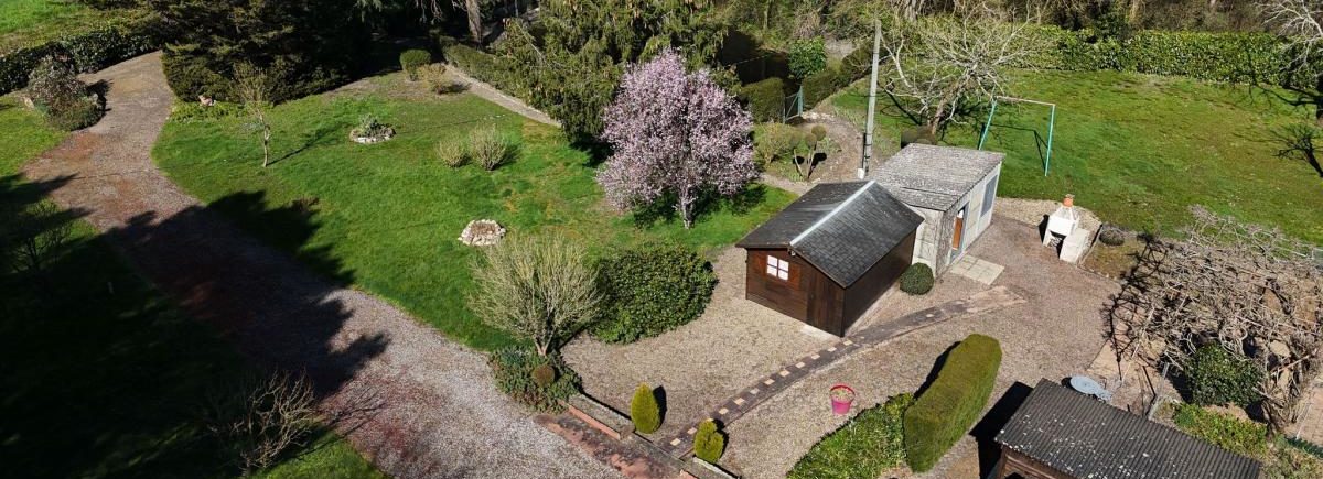 Le terrain est aménagé (chalet, terrasse, dépendances et marre) et raccordé à l'électricité.